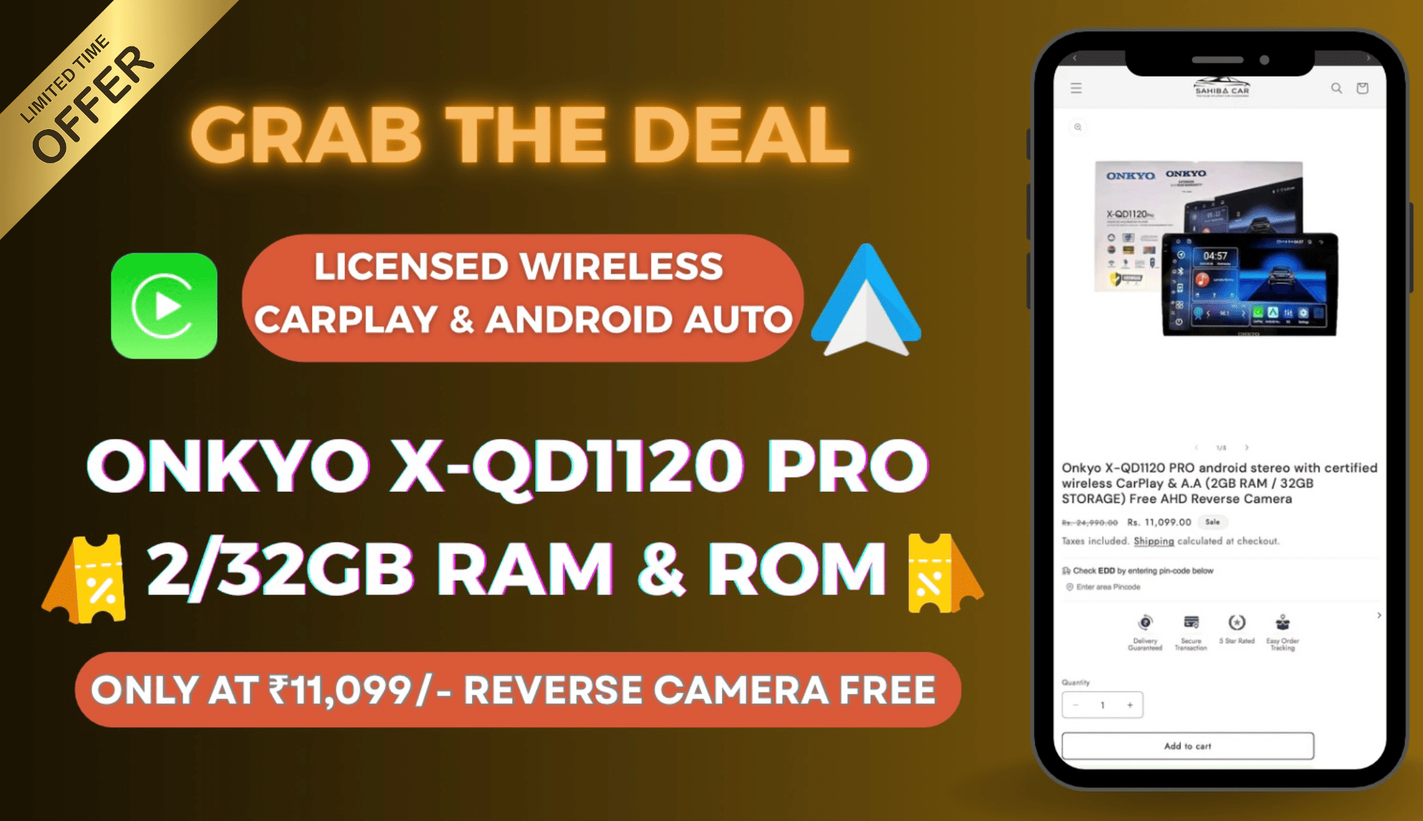 Onkyo X-QD1120 PRO android stereo with certified wireless CarPlay & A.A (2GB RAM / 32GB STORAGE) Free AHD Reverse Camera